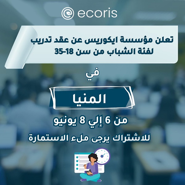 (تعلن مؤسسة ايكوريس للتنمية المستدامة عقد تدريب لفئة الشباب من سن 18 -35 سنة في محافظة المنيا وابرز موضوعات التدريب هي: مفاهيم التنمية المستدامة / التنوع البيولوجي / إدارة النفايات / الطاقة المتجددة- التغير المناخي والنوع الاجتماعي. مهارات رصد وتوثيق وآلية التعامل مع انتهاكات الحقوق البيئية. في الفترة من 6 إلي 8 يونيو 2024 في مقر “مكتب الخدمات الإنسانية I.D.A.M